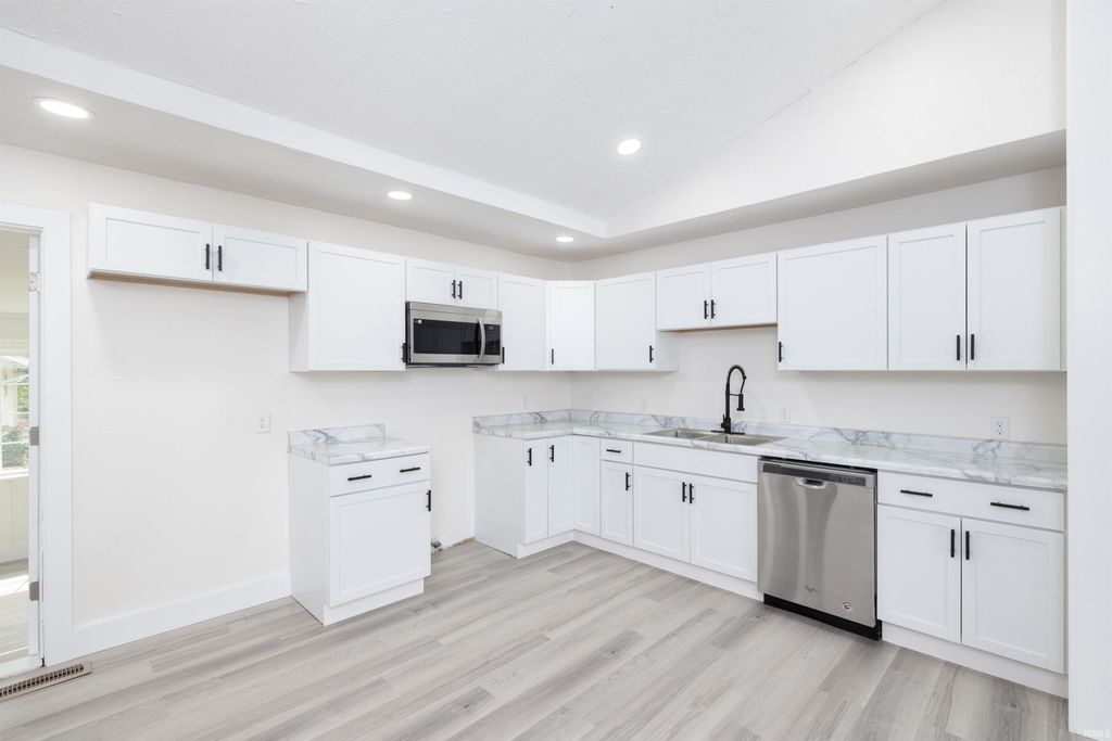 This beautifully remodeled 3 bed/2 bath home sits on a quarter-acre lot and is packed with upgrades. Step into the expansive living room, where vaulted ceilings and a charming wood-burning stone fireplace create a warm and inviting atmosphere. The kitchen shines with brand-new cabinets and sleek countertops, while both bathrooms have been thoughtfully renovated. The home features new flooring throughout, adding a fresh and cohesive feel to every room. Inside and out, it boasts fresh paint for a crisp, modern look. Storage is abundant thanks to an attached one-car garage, a detached garage/workshop, and a spacious shed. This move-in ready gem is one you won't want to miss!