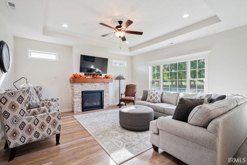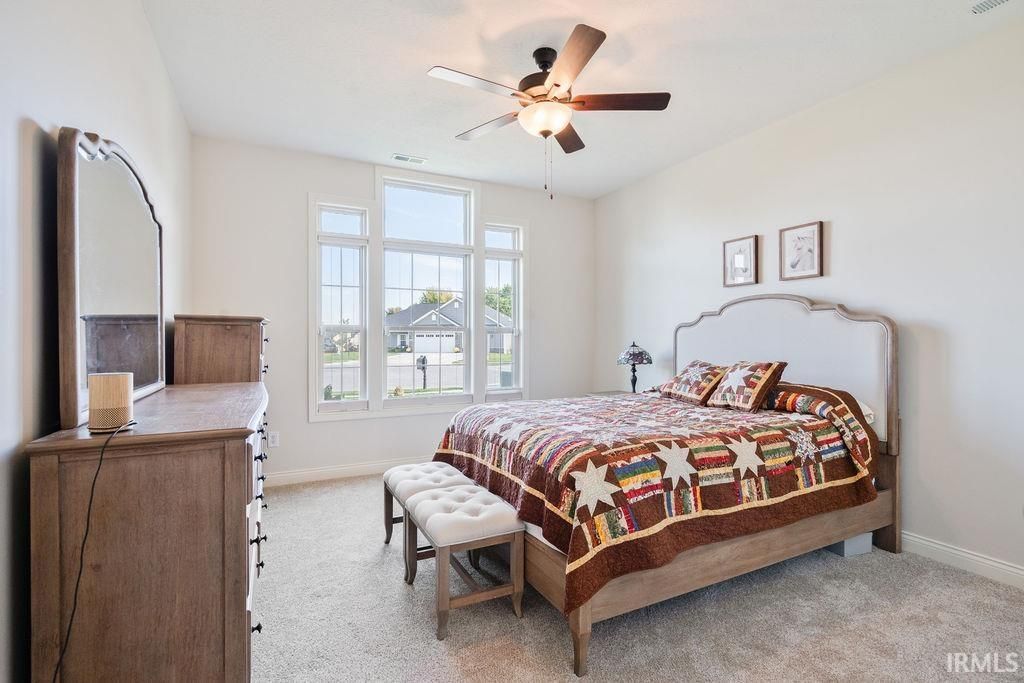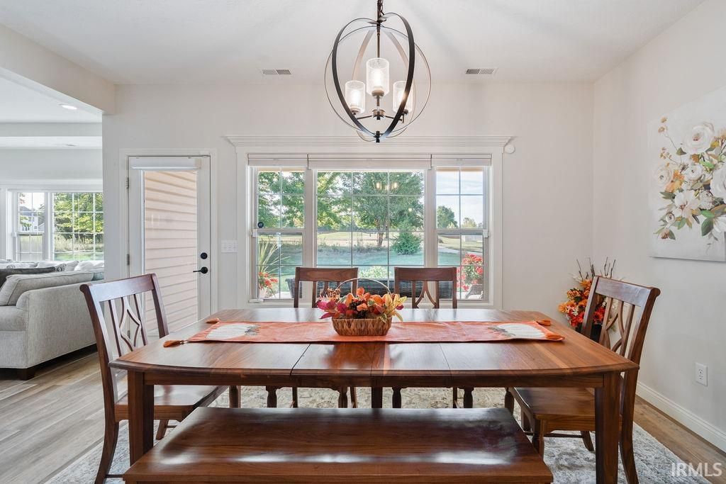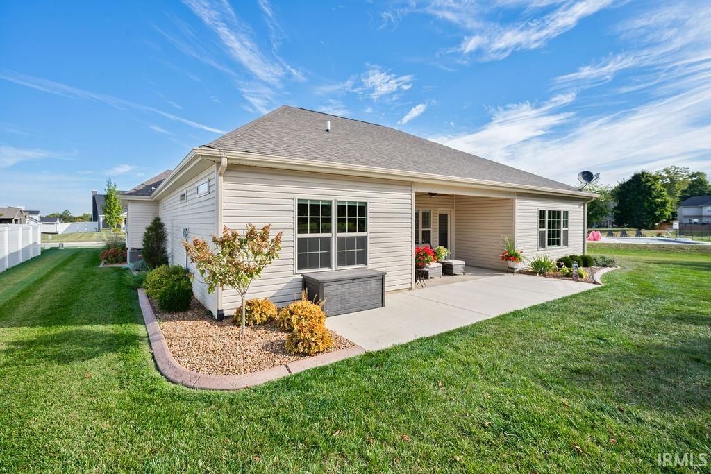 Nearly new Citation-built ranch home in desirable Autumn Woods subdivision with golf course view! Offering 2096 sq ft of living space, this 3 bedroom, 2 bath home is packed with upgrades. Foyer entry leads to an open concept great room with tray ceiling and gas fireplace. The kitchen is a chef's dream and is equipped with custom cabinetry, quartz countertops, tile backsplash, breakfast bar seating, and all stainless steel appliances-including a separate beverage refrigerator! A spacious dining area with a picture window overlooks the 6th hole of the Wildcat Golf Course. Primary suite features a tray ceiling, large walk-in closet, and spa-like ensuite bathroom with tile surround walk-in shower, soaking tub, dual sink vanity, and ceramic tile flooring. The split floor plan provides privacy with the 2 additional bedrooms and a stylish guest bath with its own walk-in tile surround shower on the opposite side of the home. Other interior features include an oversized laundry room with utility sink and custom blinds throughout. Enjoy outdoor living on the covered back patio with ceiling fan, surrounded by professional landscaping with custom concrete edging and a full yard irrigation system. A 2 car attached garage with bump out storage completes this beautiful home.