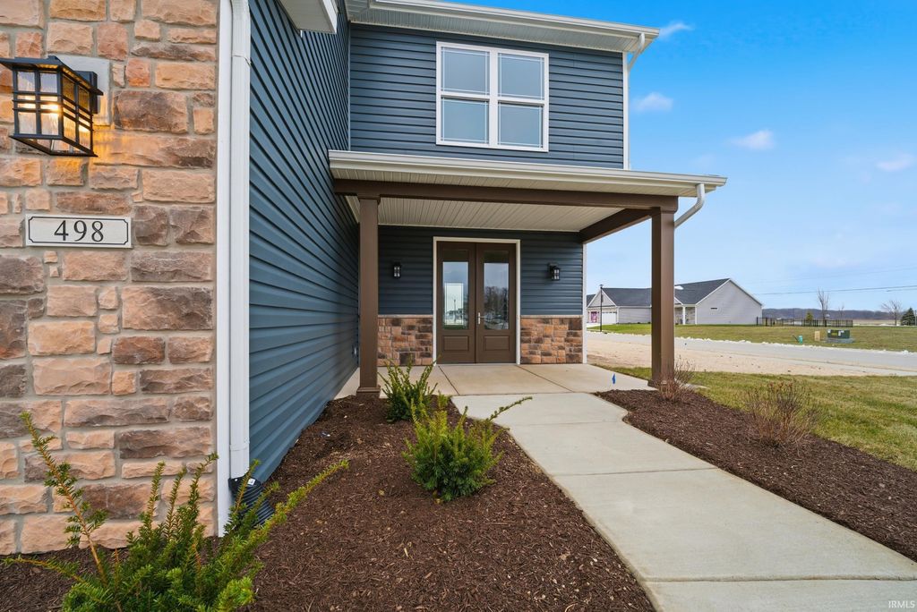 Welcome to the brand new Milakis Homes built Annie floor plan, a stunning two-story residence thoughtfully designed for modern living and nestled on a large corner lot in the quiet cul-de-sac of East Lafayette's desirable Barrington Woods neighborhood. This 4-bedroom, 2.5-bath, 2,329 square-foot home offers both elegance and functionality, ideally located just minutes from SR26, I-65, Purdue University, SIA, hospitals, shopping, and TSC's Wyandotte, East Tipp, and Harrison schools. The charming craftsman-style exterior showcases detailed stonework, a blend of horizontal and vertical siding, and an inviting 15x8 covered front porch that sets the tone for the quality found throughout. Inside, a double glass entry door opens to a spacious foyer with a coat closet and powder bath, leading into the expansive great room highlighted by a custom gas fireplace and triple windows that overlook the large backyard. The open-concept layout flows into a generous dining area with access to the 14x12 covered patio, perfect for outdoor entertaining, and a well appointed kitchen featuring stainless steel appliances, granite countertops, custom painted cabinetry, a tiled backsplash, and a seven-foot island ideal for gatherings. A versatile flex room on the main level provides space for a home office or additional bedroom. Upstairs, the luxurious 18x15 primary suite offers a spa-like retreat with a tiled walk-in shower, dual vanities, linen closet, private toilet room, and a spacious walk-in closet. Two additional bedrooms, each with their own walk-in closets, share a full bath, and the convenient second-floor laundry room includes added cabinetry and a folding area. Completing this beautiful home is an oversized finished three-car garage, luxury vinyl plank flooring throughout most of the main level, a water softener, and a full-yard irrigation system"”making this Milakis Homes masterpiece the perfect blend of comfort, craftsmanship, and convenience.