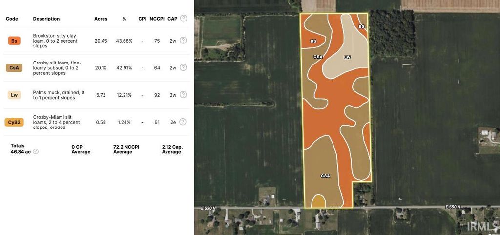 Located in northern Howard County, this 48.13-acre tract offers a well-maintained, flat, and highly productive tillable farm with long-term agricultural value. The property is currently operated in a corn, soybean, and wheat crop rotation, reflecting strong management and consistent yields. Soil composition includes a desirable mix of silty clay loam, silt loam, and muck soils, supporting both productivity and versatility across crop types. With an average NCCPI of 72.2 and an impressive WAPI of 163.29, this farm demonstrates above-average soil performance and income potential for the area. The level topography allows for efficient farming practices, ease of equipment access, and reduced erosion concerns. In addition to its agricultural appeal, the property offers a potential build site, making it suitable for those looking to combine farming with a rural residence or future investment. Whether expanding an existing farming operation, securing quality tillable acres, or planning for future development, this Howard County farm presents a strong opportunity in a desirable location.