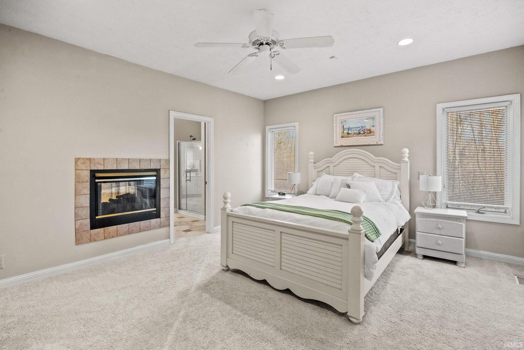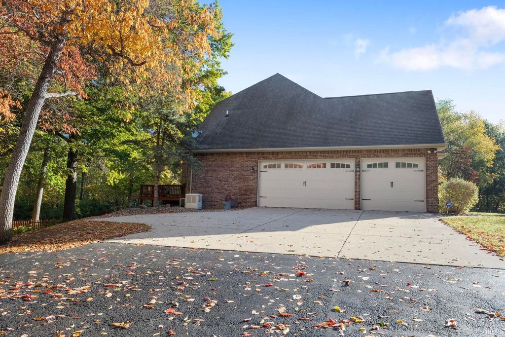 One-owner home on 10+ acres in Haggarty Hills- minutes from I65 and area hospitals- offering over 5,000 sq ft and a 6-car garage. Main-level primary suite with two-sided fireplace, den off foyer, and great room with gas fireplace. Three bedrooms and two full bathrooms upstairs. Walk-out basement features ample recreation space-- wood-burning fireplace, wet bar, full bath, and two large storage rooms. Sunroom & large deck. Property includes a pond suitable for winter skating, fenced backyard, and mature plantings (cherry, pear, and apple trees, plus raspberry and blueberry bushes.) Frequent wildlife. Zoned HVAC, two water heaters (electric and gas), and back-up generator.