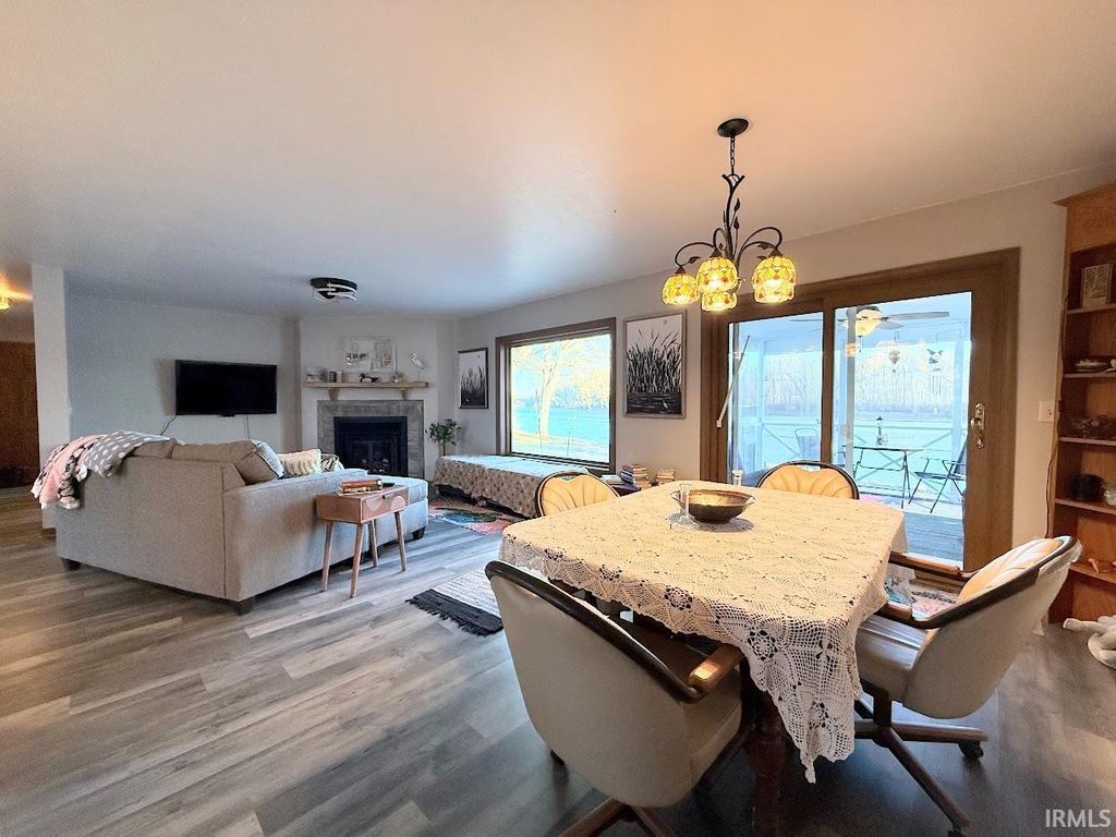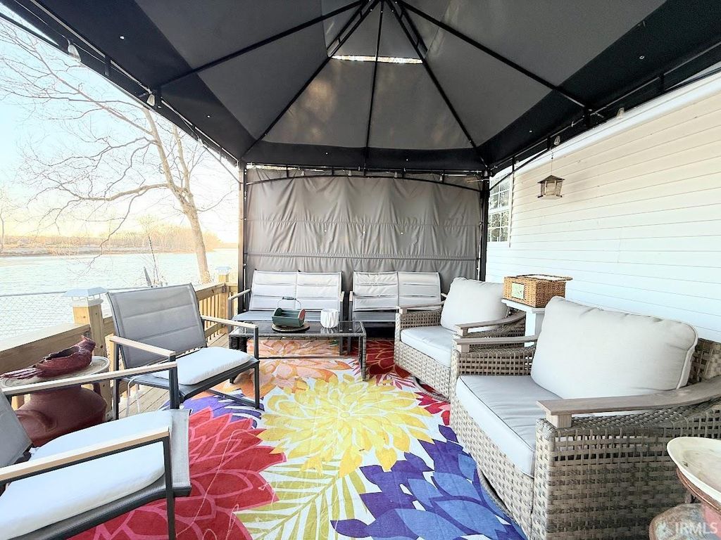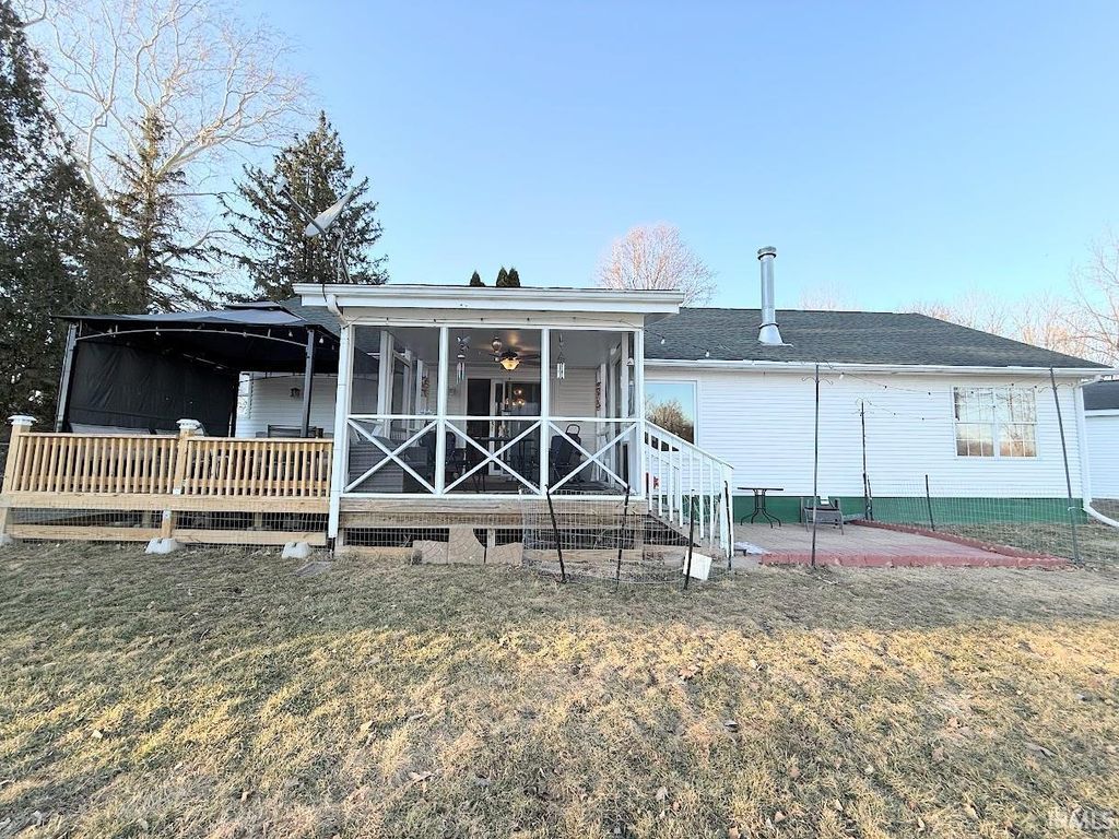 This charming modular home with a retired title combines comfort with serenity. Inside you will be greeted by a large great room with a cozy fireplace, which has been serviced recently. The kitchen has ample cabinets and solid surface counters. There is bar seating for convenience. All appliances are included. The primary bedroom offers a private retreat with an en-suite bath featuring double sinks and a soaking tub. Outside, enjoy two beautiful spaces to soak up the views of the Wabash River. A screened porch invites you to relax and enjoy the view, and stylish pergola provides a perfect spot for chilling or entertaining. A two-car garage is included as well as a fenced back yard. A young orchard with cherry, plum, pear and peach trees, along with a berry patch with blackberries, gooseberries, and raspberries. There are lots of perennials, the seller will be taking some starts. Don't miss an opportunity to own a property with sweeping views of the Wabash River!