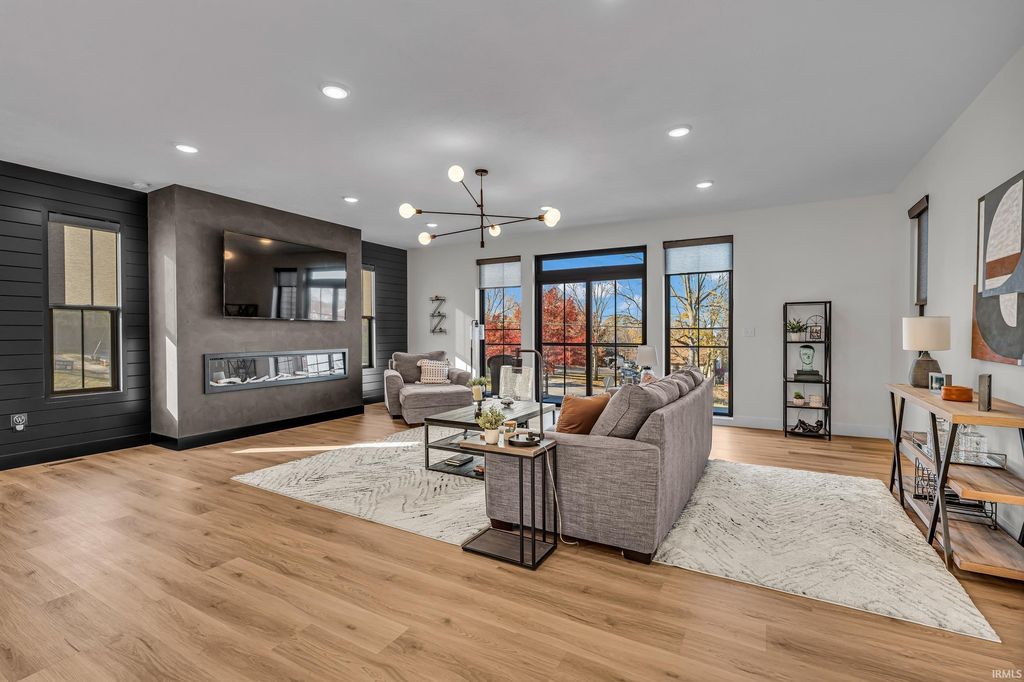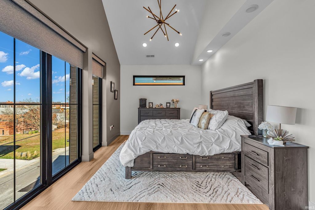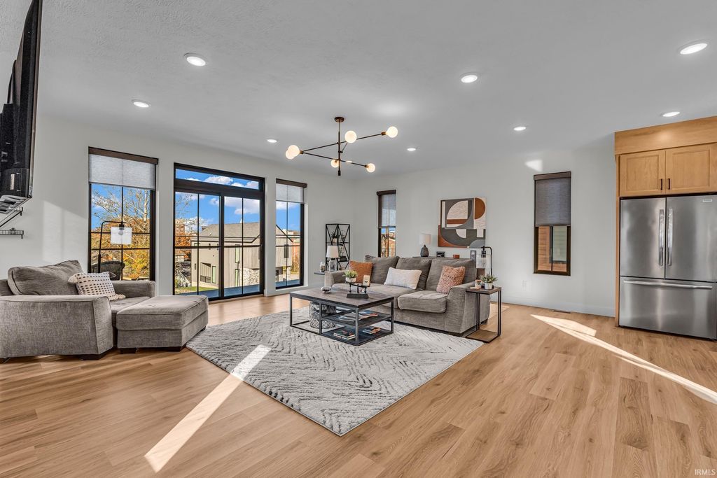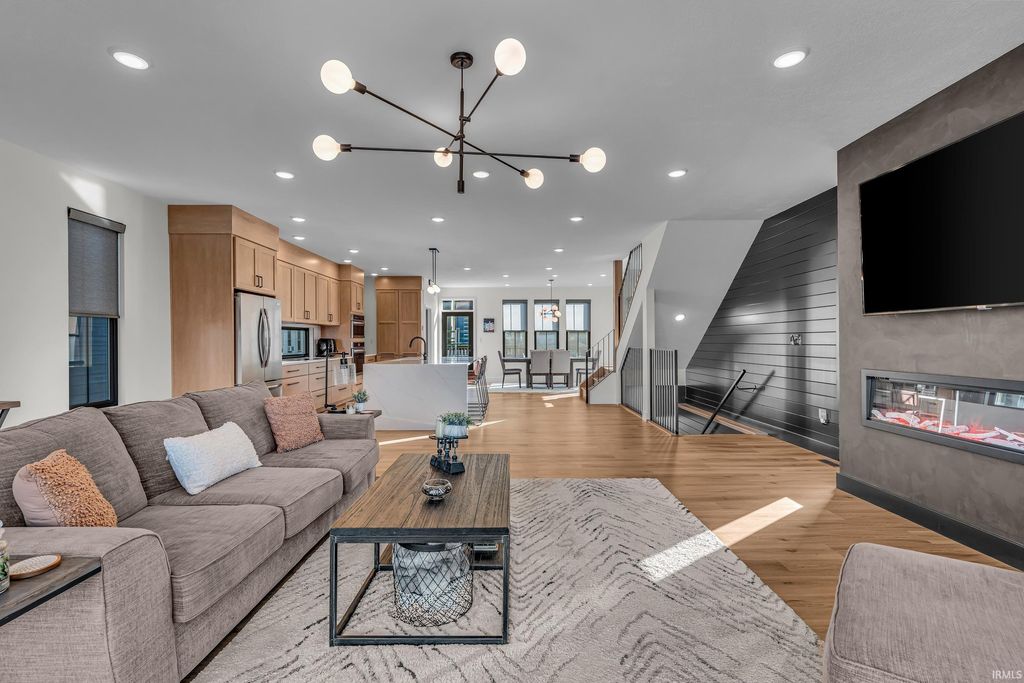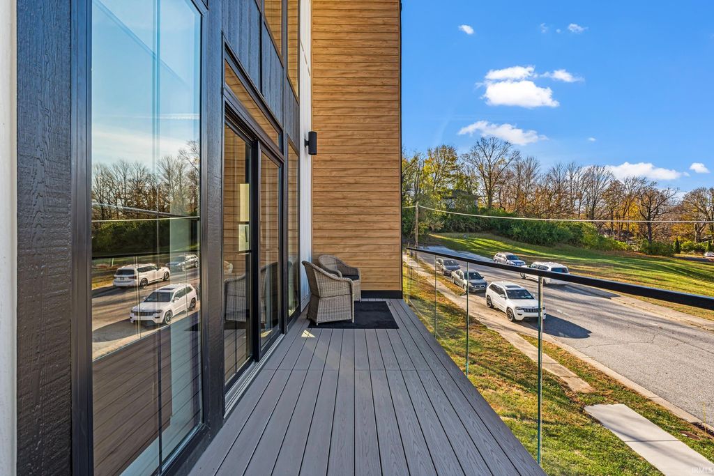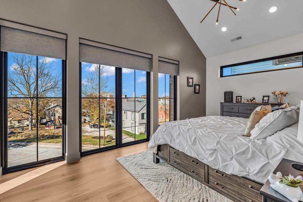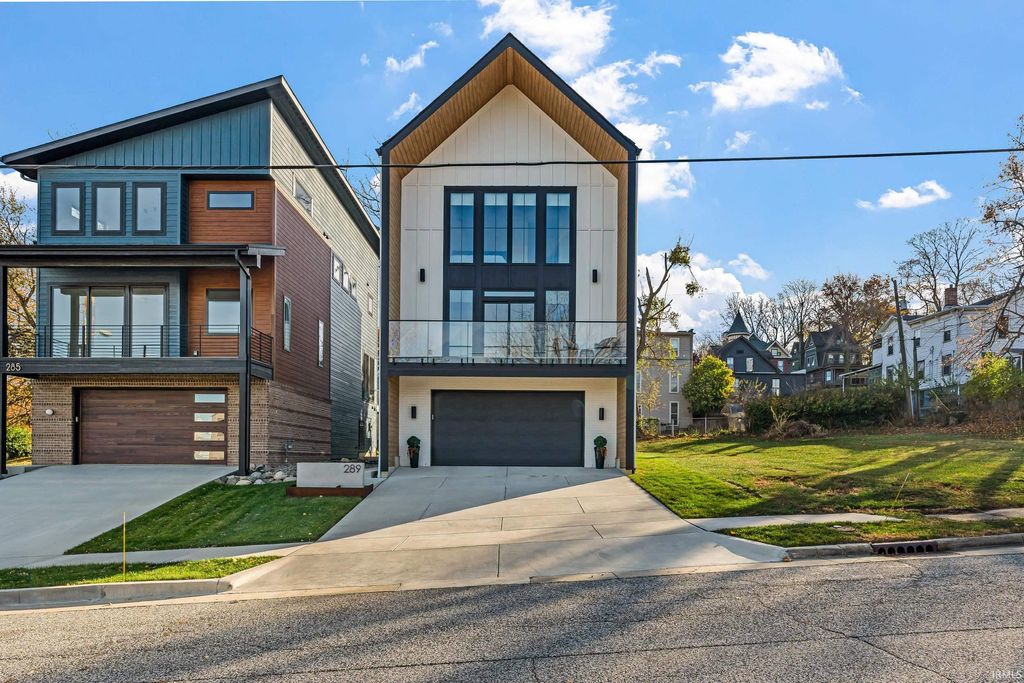 Welcome to 289 South 8th Street, a stunning modern home in the heart of downtown Lafayette. Built in 2023 by Steve Schrader Homes, this 3-story, 2,736 sq ft residence blends luxury design with urban convenience - just two blocks from Main Street's shops, restaurants, and easy commute to Purdue University. Inside, sunlight pours through oversized windows, highlighting the open-concept layout, hardwood floors, and high-end finishes. The gourmet kitchen features a massive waterfall-edge island, quartz countertops, custom white-oak cabinetry, and designer fixtures. The spacious living area centers around a sleek linear fireplace and opens to a 23 foot glass-railed balcony with downtown views - perfect for relaxing or entertaining. Upstairs, the vaulted owner's suite feels like a retreat, offering a custom walk-in closet and a spa-inspired bath with quartz double vanity, walk-in shower, and warm gold accents. Two additional bedrooms, a flexible first-floor space, and three and a half baths provide comfort and versatility. An attached 2 car garage, rear deck, updated landscaping and thoughtful craftmanship throughout complete this one-of-a-kind home. A must see!